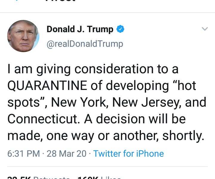 The prominent leader of the United States of America took to his verified Twitter handle to declare that he is going to be giving consideration to a QUARANTINE of developing “hot spots”, New York, New Jersey, and Connecticut.