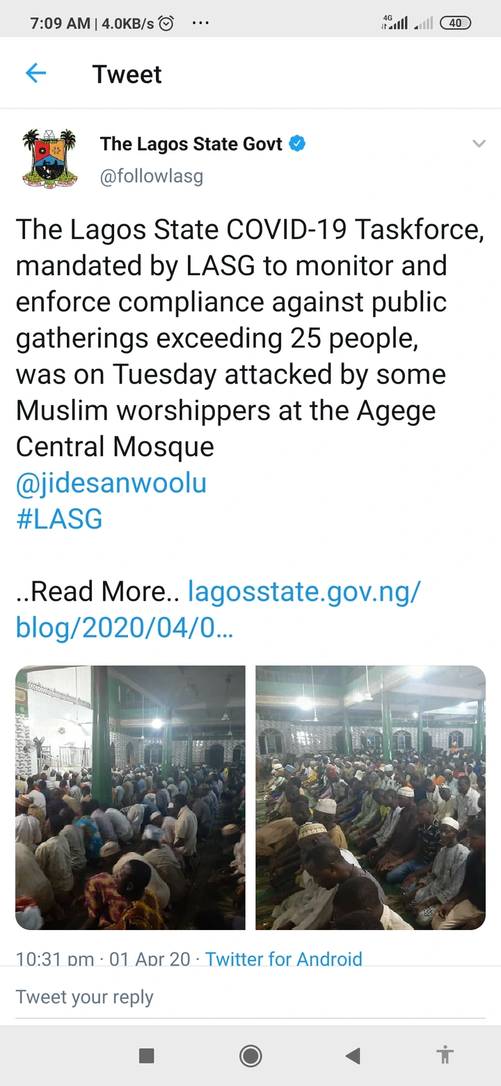 —The Lagos State [LASG] COVID-19 Taskforce were reportedly attacked by Muslims at Agege while trying to make them comply with the social distancing rule.